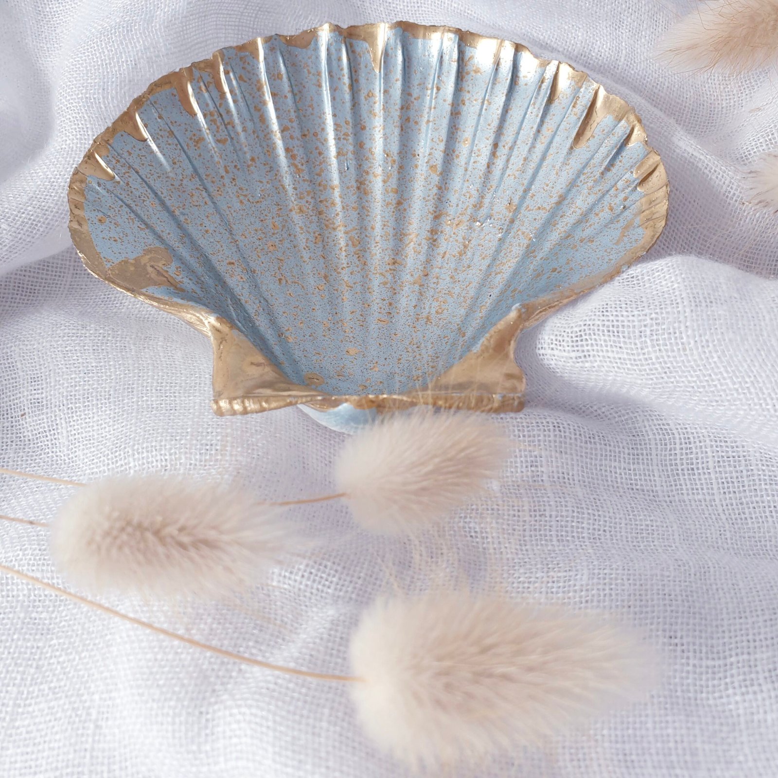 Elevate your space with our Hand-Painted Scallop Shell – ‘Aqua’. This one-of-a-kind piece features a soft blue base with delicate gold speckles, complemented by a gilded edge for a timeless, elegant touch. Perfect as a decorative accent or a unique gift, this shell brings a hint of coastal luxury to any setting.