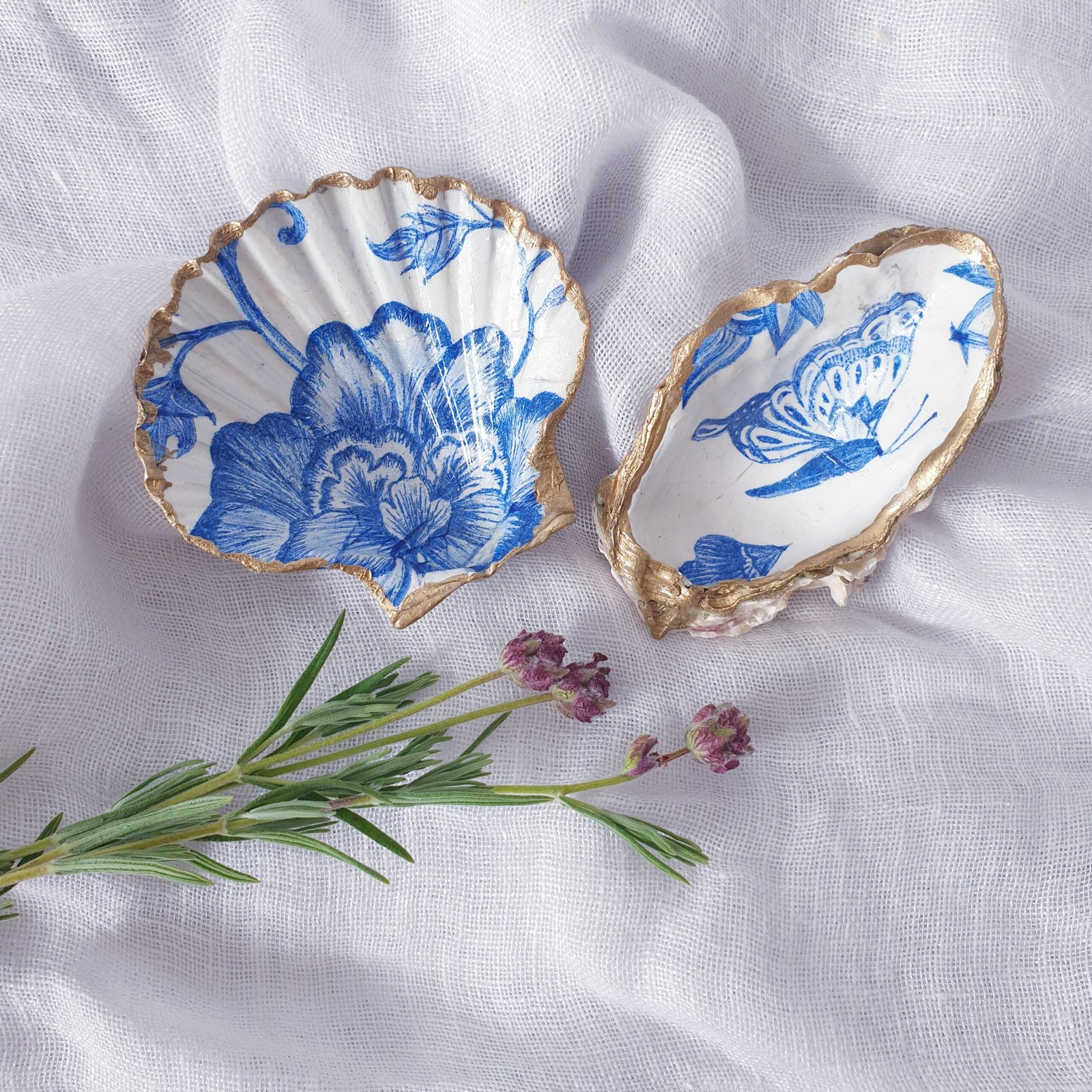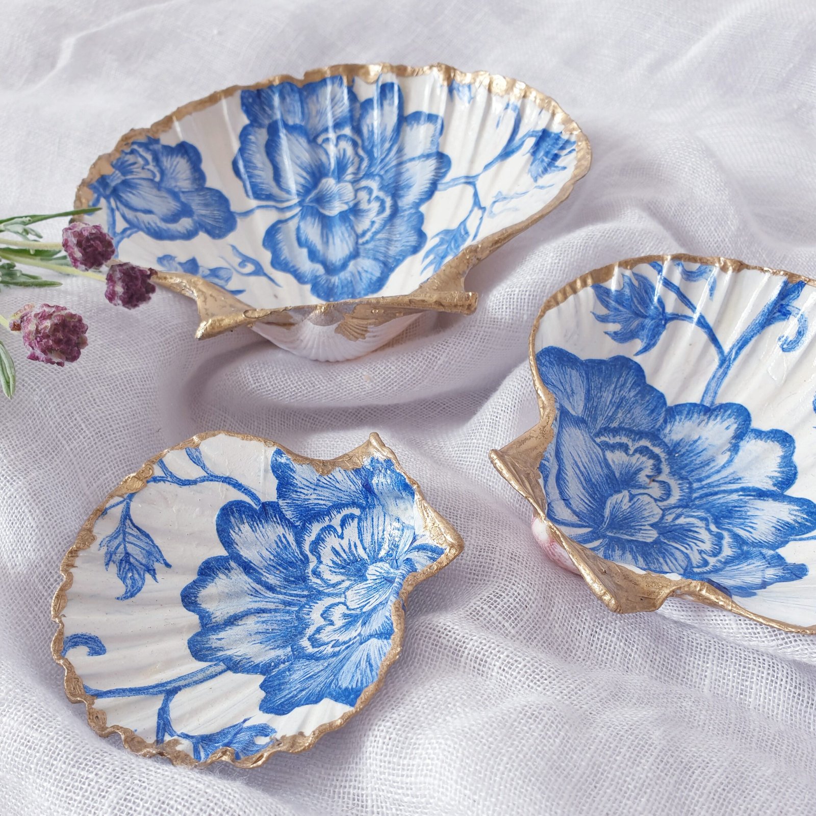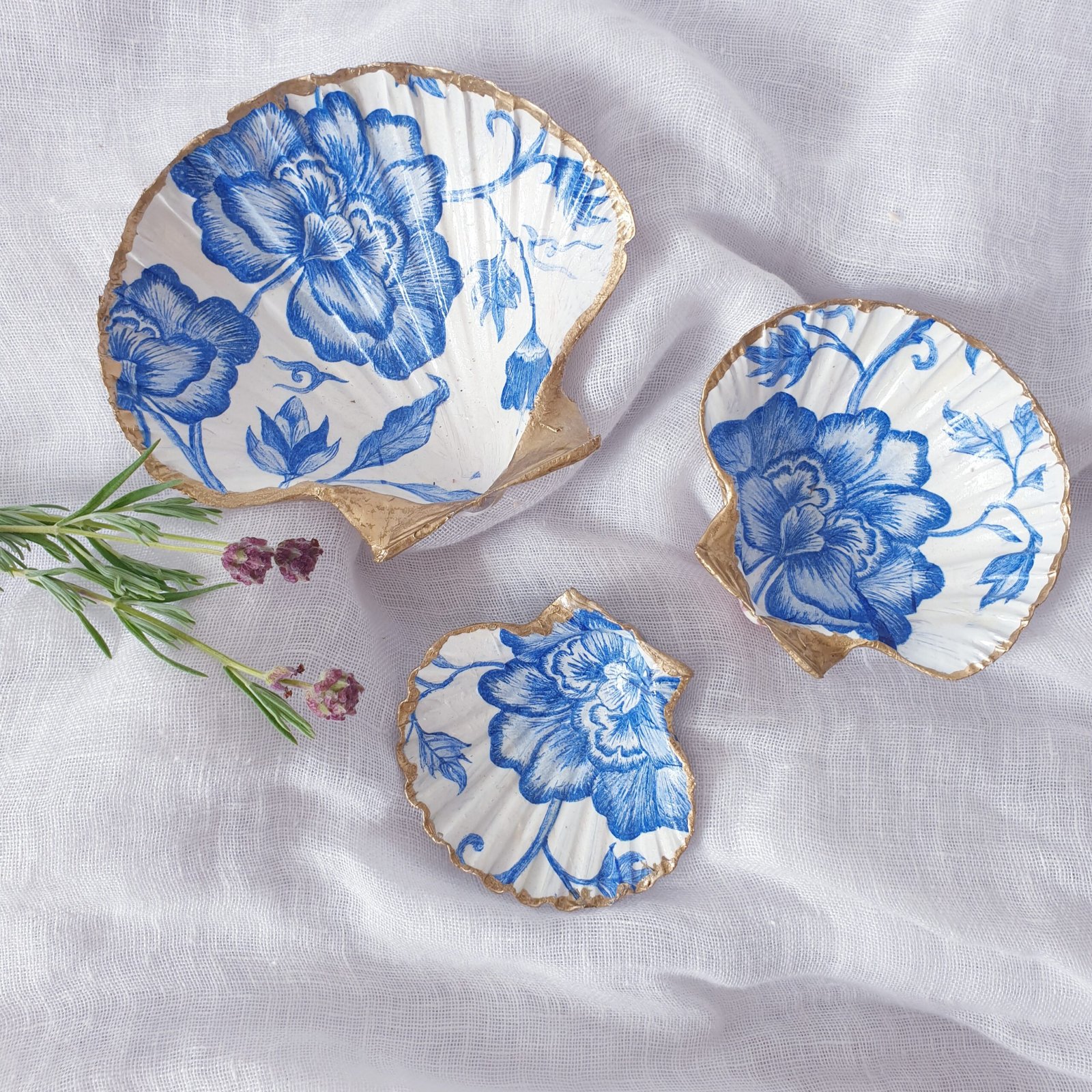 Handmade decoupage shells featuring carefully selected prints, perfect for home décor or gifting. Each shell is crafted with attention to detail, creating a unique and elegant piece. The featured print here is ‘Vintage Blue.’